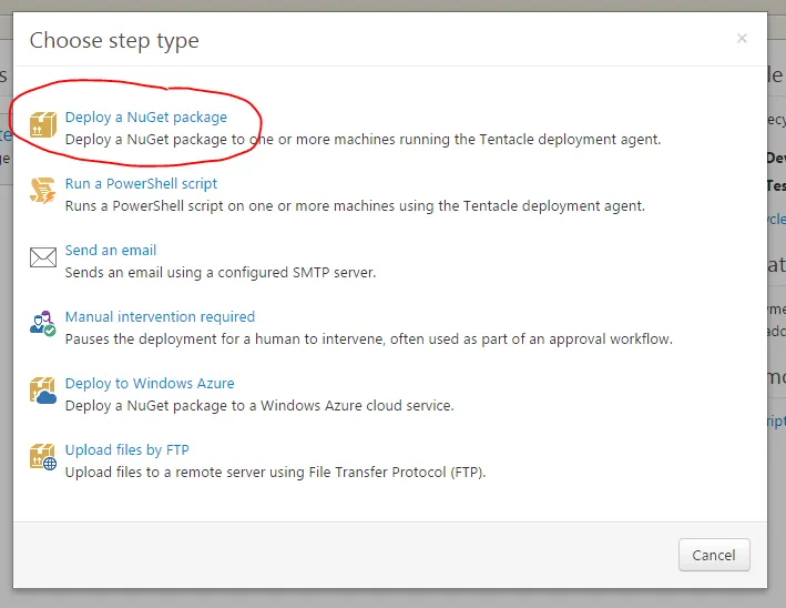 Then we’ll select “Deploy a NuGet package” as our step type.
